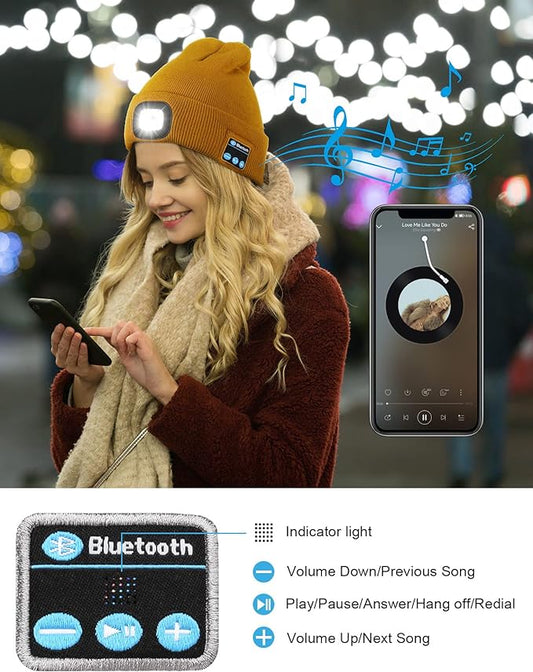 Beanie Hat with LED Headlight and Bluetooth Speakers